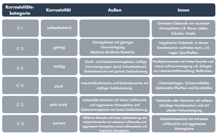 Je nach Umgebung korrodieren Eisenmetalle wie Stahl unterschiedlich schnell. Die DIN EN ISO 12944-2 legt hierfür verschiedene Korrosivitätskategorien fest. Sie dienen dazu den notwendigen Korrosionsschutz, für Konstruktionen und Bauteile in verschiedenen Umgebungen mit spezifischen Korrosivitäten, festzulegen.