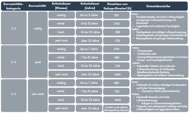 Korrosivitätskategorien mit Schutzdauern - Vergleich C5H mit C3 und C4